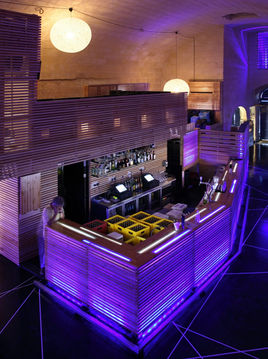 Inspired by the original warehouse Vaults at Pinto Stores, the concept of Q-bar became the stacking of crates into sculptural tower-like volumes containing all the services needed. By night, the timber batten clad structures light up and together with the inner layer of multicoloured tiles and the floor pattern of intersecting lines a city-like scenography is achieved.